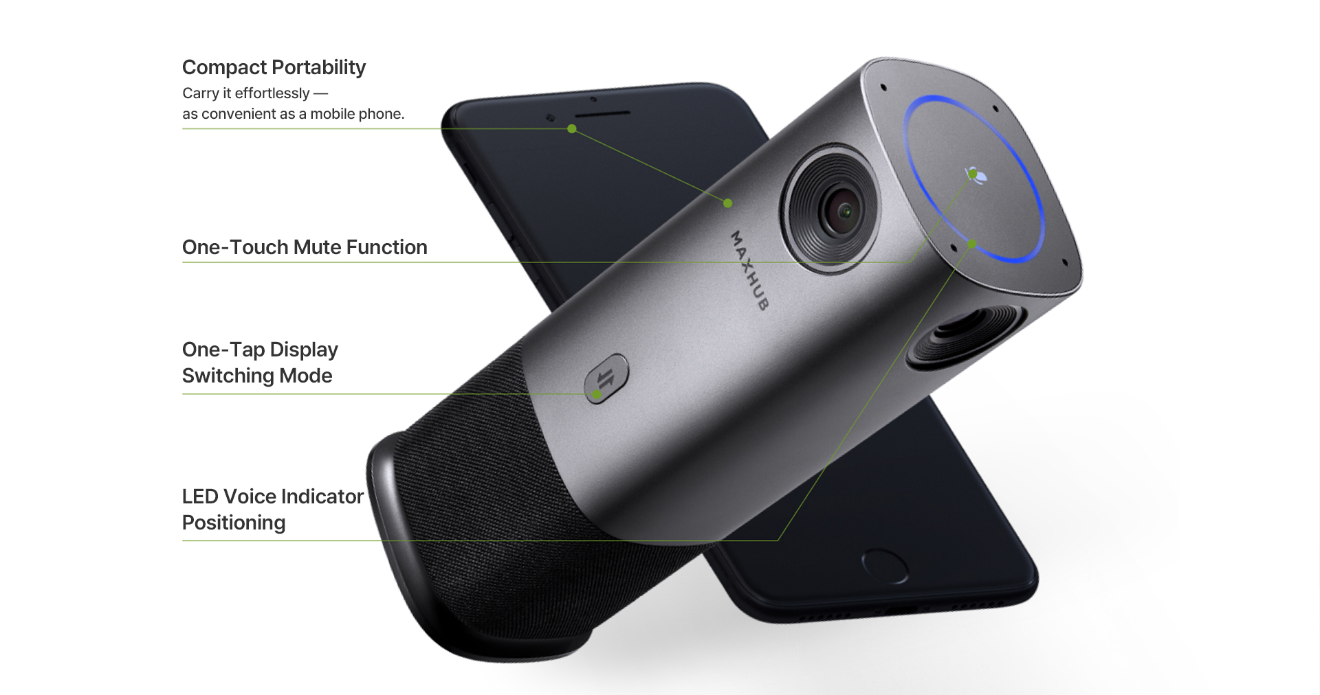 The MAXHUB M40 integrates a 360° camera, speaker, and voice-tracking microphones into a stylish, highly portable design.
